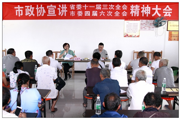 7月24日,按照市委统一安排部署,市政协主席陈莉萍率市政协机关、市国土资源局到联系的安岳县岳源乡宝林村、三眼村和软弱涣散村——新店村,宣讲省委十一届三次全会和市委四届六次全会精神。在三眼村村委会,岳源乡干部职工和三个村的村两委干部、党员、群众代表齐聚一堂,认真聆听了莉萍主席对省委十一届三次全会和市委四届六次全会主要精神和核心要义的解读。