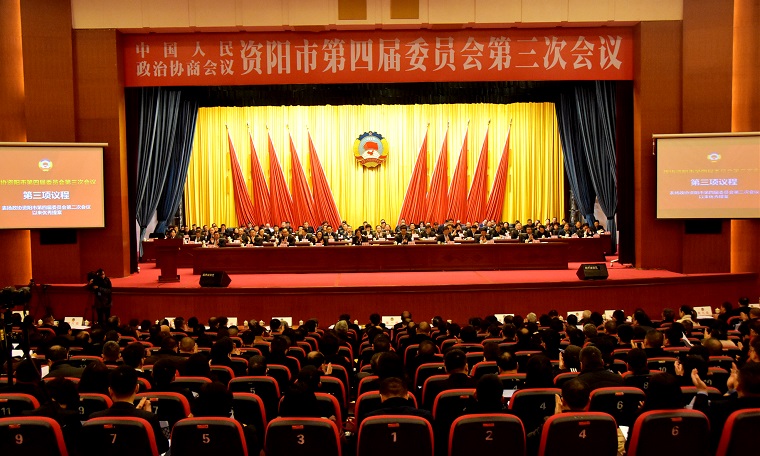 上午9点整,大会主持人陈绍华宣布大会开幕,全体起立,奏唱中华人民共和国国歌。随后,大会审议通过政协资阳市第四届委员会第三次会议议程。