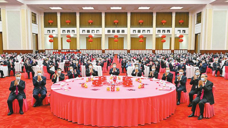 人民大会堂宴会厅灯光璀璨、暖意融融,各界人士齐聚一堂、共迎新春,现场洋溢着欢乐祥和的节日气氛。